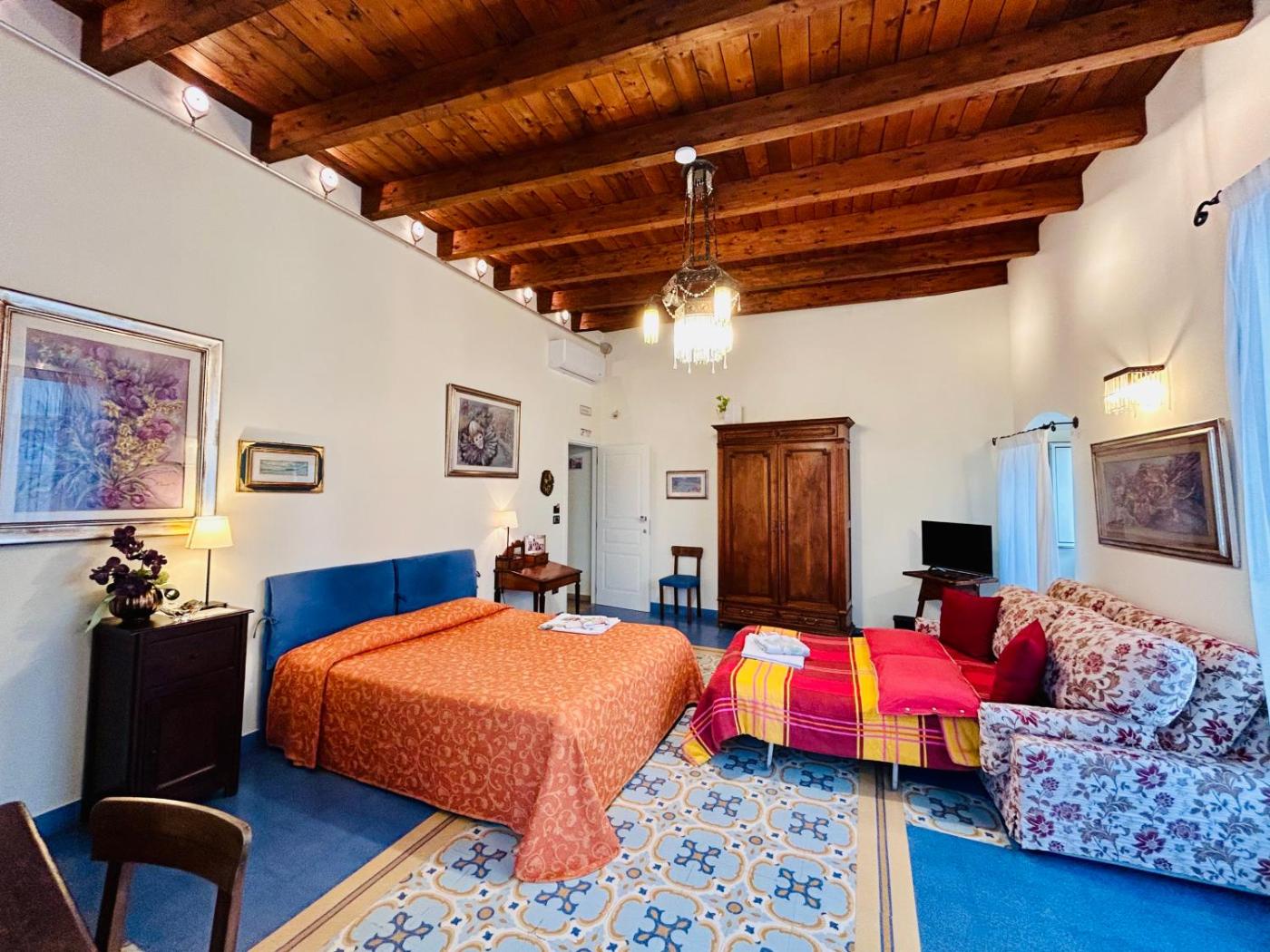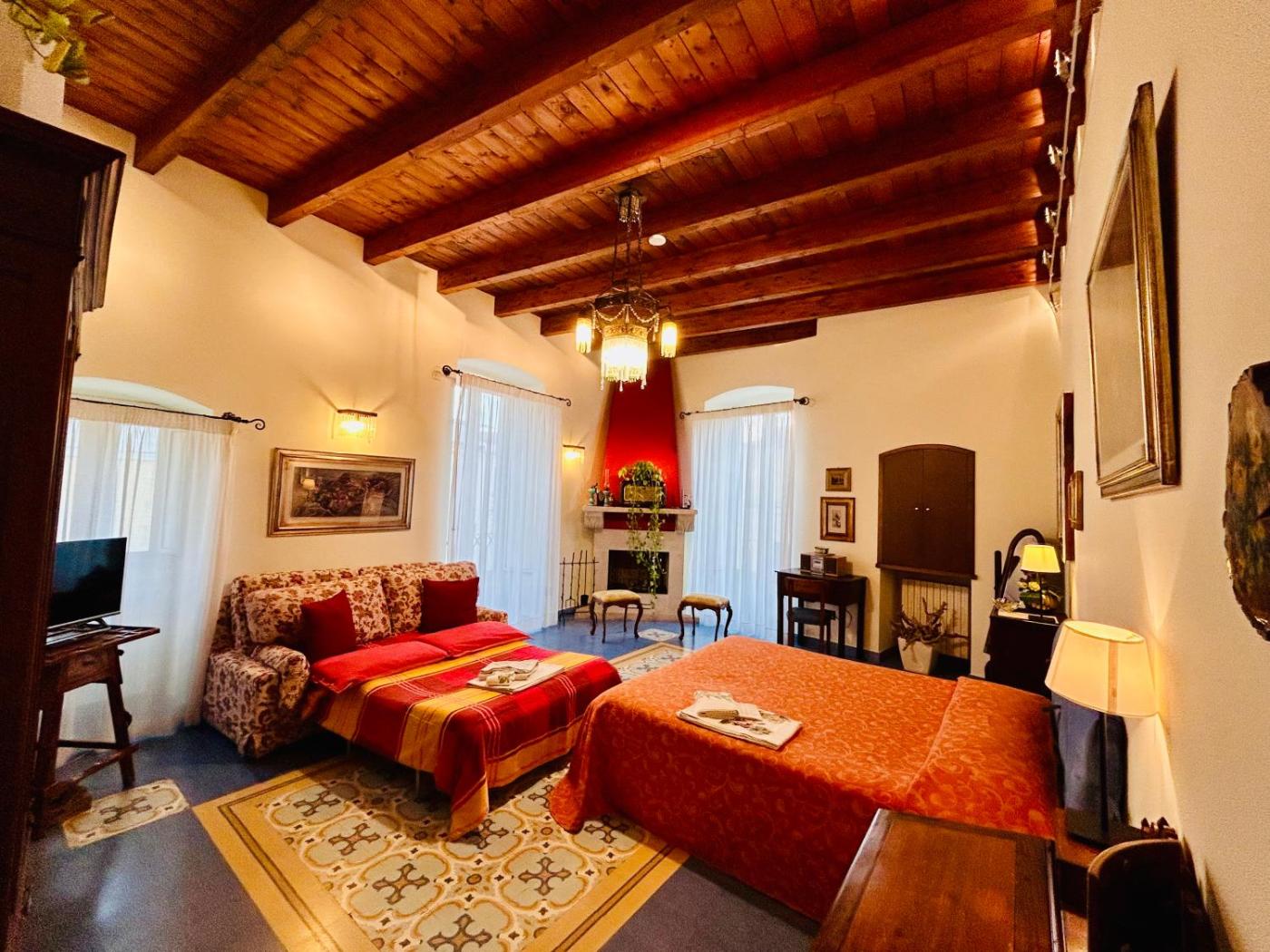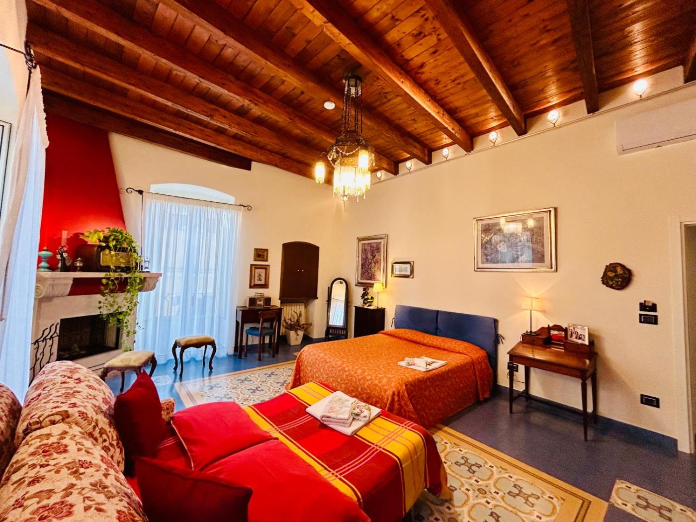 Junior Suite. Junior suite situata nella dependance, a 50 metri dall’edificio principale, e dotata di aria condizionata, soffitti tradizionali con travi in legno a vista e balcone o finestra. Ciascuna presenta un arredamento personalizzato, con toni di rosso o blu. L’edificio è privo di ascensore. Le Junior Suite si trovano in Via Fanfulla 11. ;
