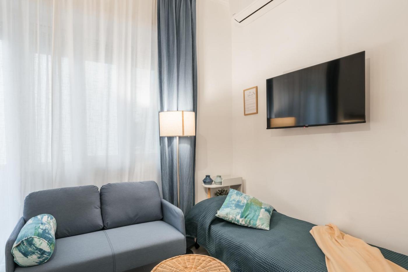 Appartamento con 1 Camera da Letto. Questo appartamento climatizzato con ingresso indipendente e cucina comprende 1 camera da letto e 1 bagno con doccia e bidet. La cucina è ben attrezzata con utensili, piano cottura, frigorifero e forno. L’unità abitativa è dotata di terrazza con vista sul cortile interno, lavatrice e TV a schermo piatto con canali satellitari. L’alloggio presenta 2 letti.
