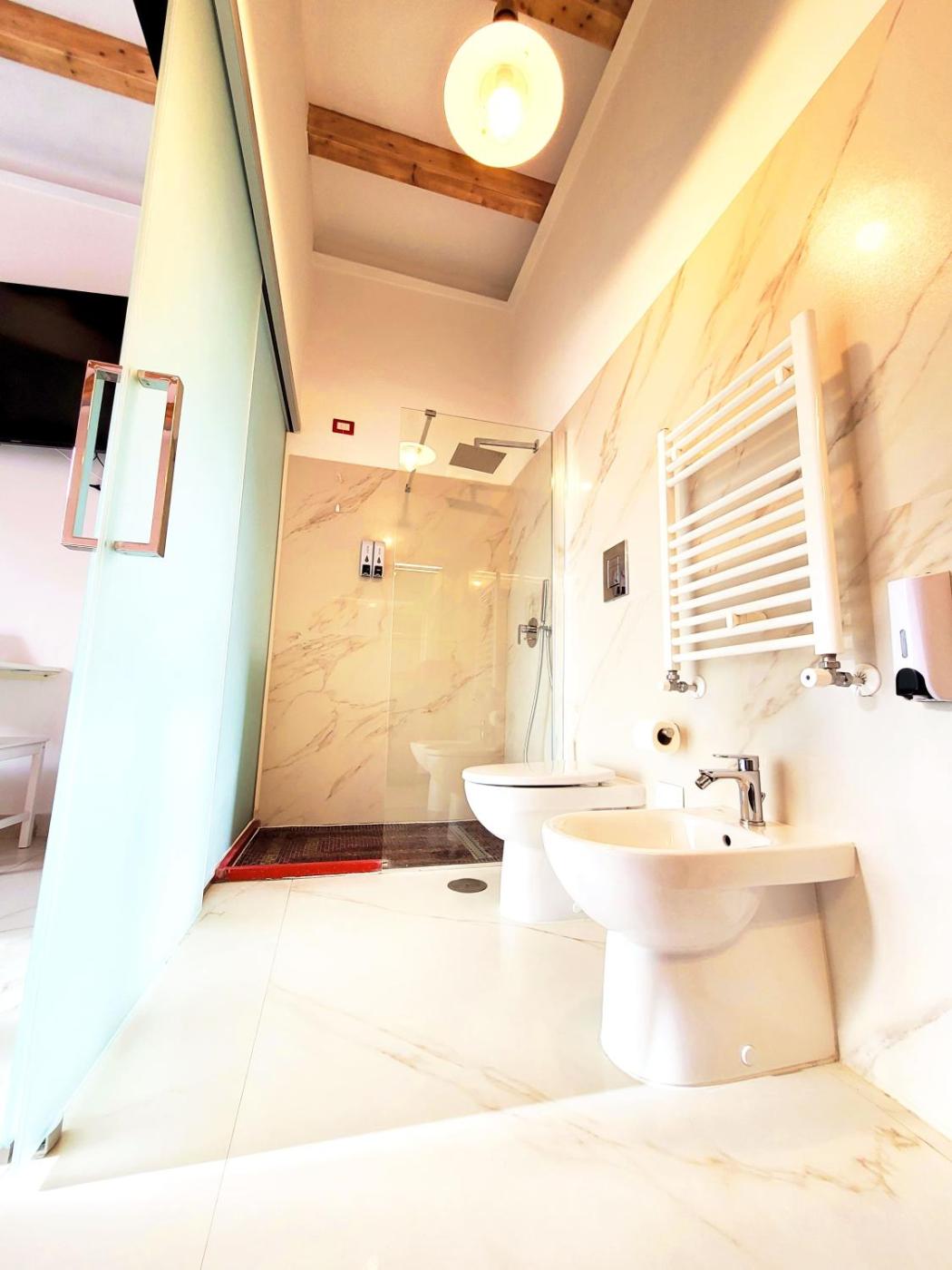 Camera King Deluxe. Offering free toiletries, this double room includes a private bathroom with a shower, a bidet and a hairdryer. The spacious air-conditioned double room offers a flat-screen TV with streaming services, a private entrance, soundproof walls, a minibar as well as city views.