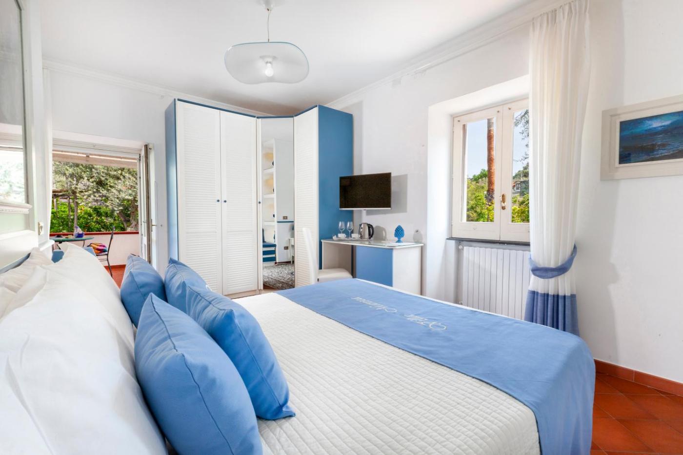 Camera Matrimoniale con Vista Giardino. Camera matrimoniale climatizzata dotata di ingresso indipendente, terrazza con vista sul mare e bagno privato completo di doccia. L’alloggio dispone di 1 letto. ;
