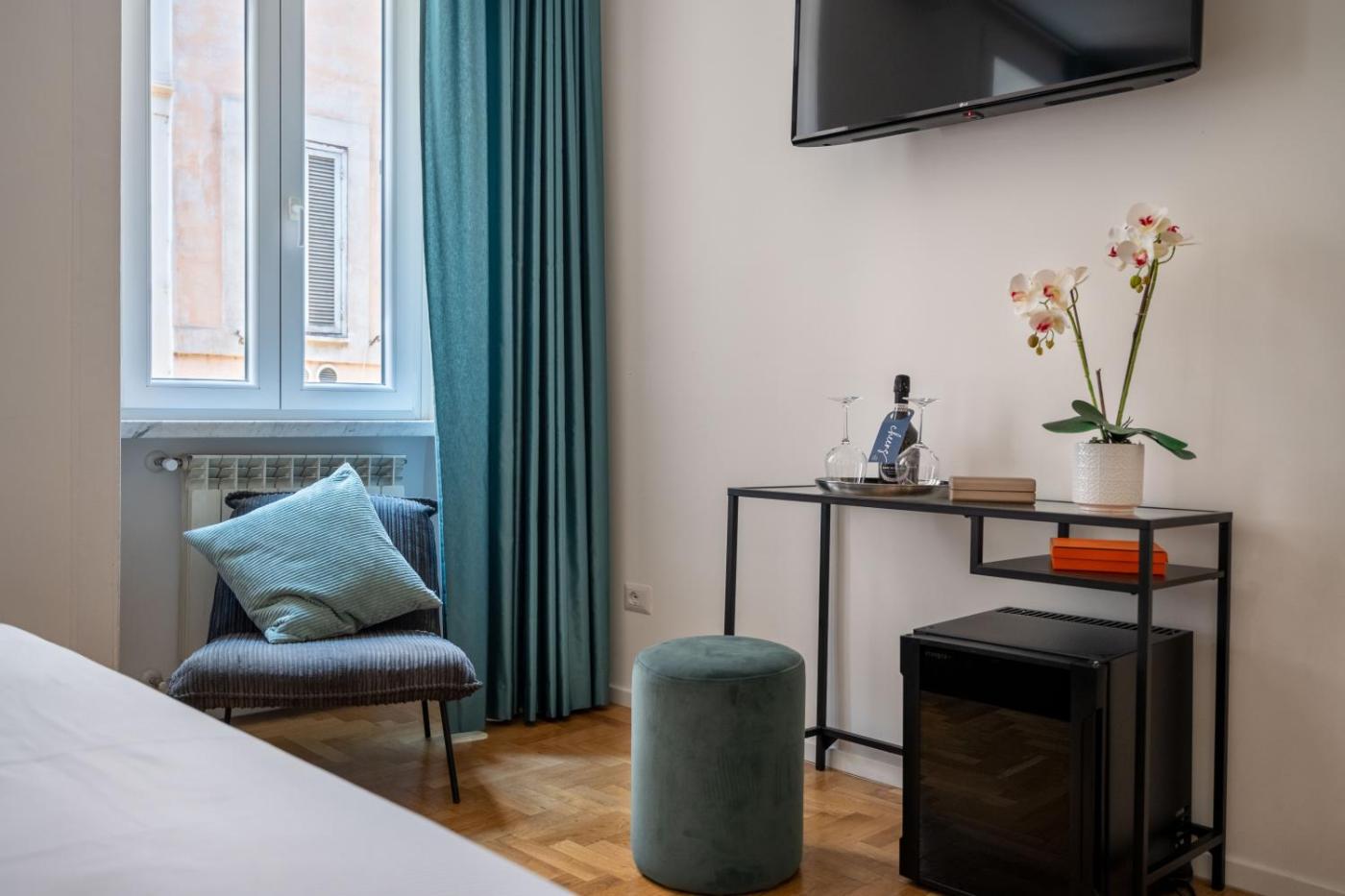 Camera Matrimoniale Piccola. Camera matrimoniale provvista di bagno privato con doccia a filo pavimento, asciugacapelli, bidet edi cortesia. Questa camera matrimoniale è dotata di aria condizionata, TV a schermo piatto, ingresso indipendente, pareti insonorizzate, minibar e vista sul cortile interno. L’alloggio presenta 1 letto.