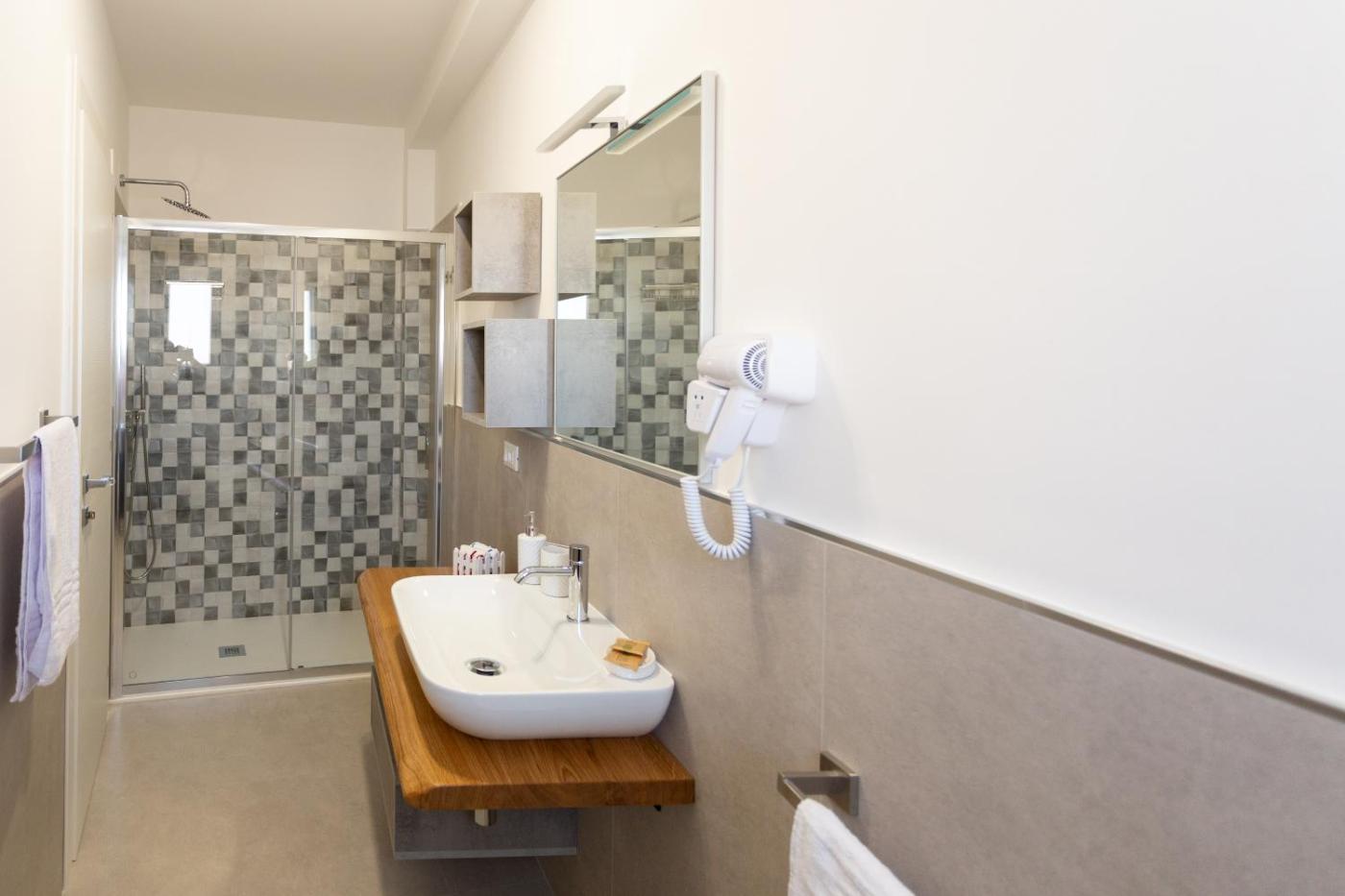 Camera Matrimoniale Deluxe con 1 Letto Supplementare. Camera matrimoniale spaziosa dotata di aria condizionata, ingresso indipendente, terrazza con vista sul giardino e bagno privato con doccia.