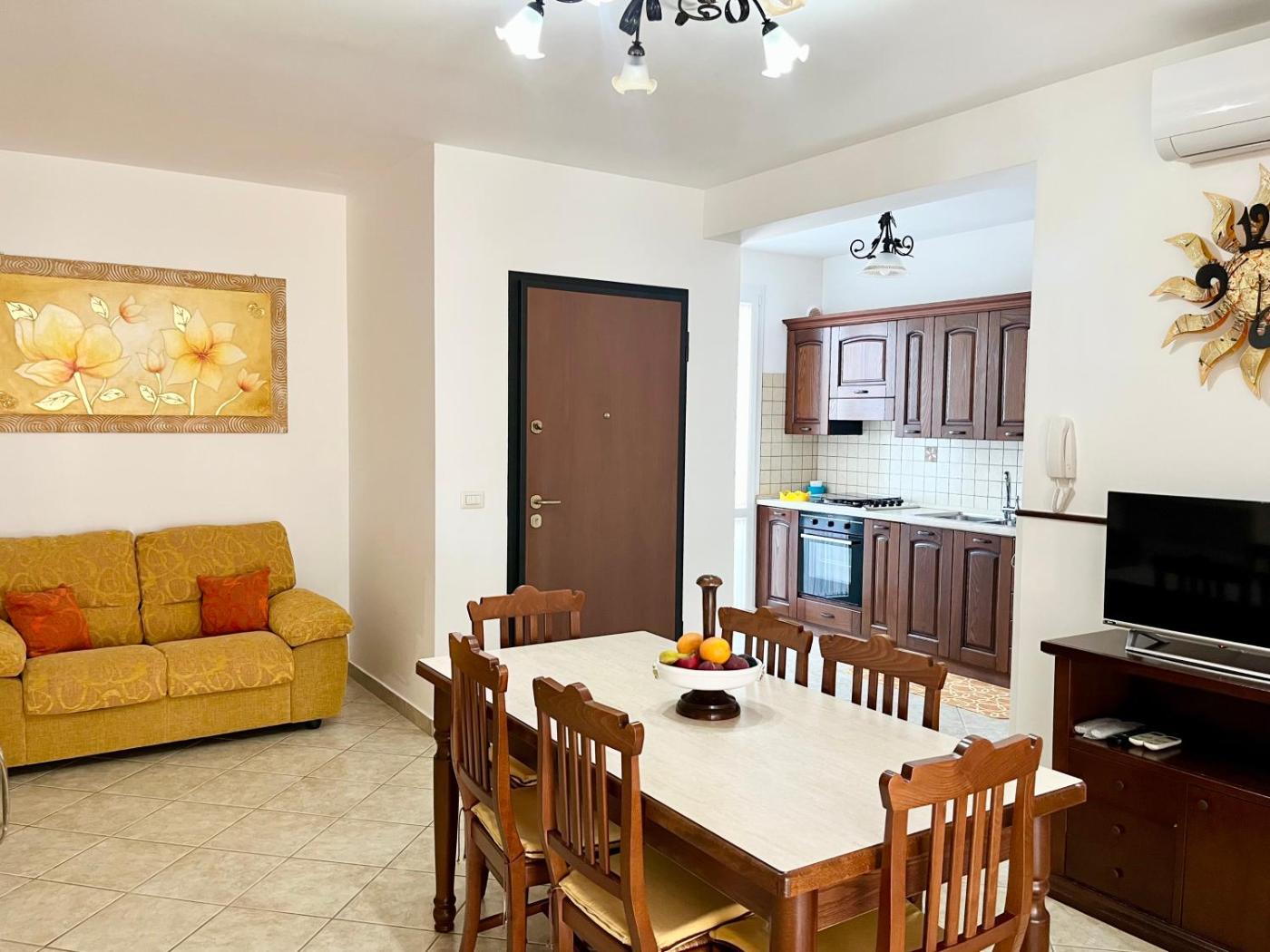 Questa casa vacanze con aria condizionata comprende 3 camere da letto, un soggiorno, una cucina con utensili più frigorifero, e 2 bagni con bidet edi cortesia. Presso questa casa vacanze troverete asciugamani e lenzuola in dotazione.